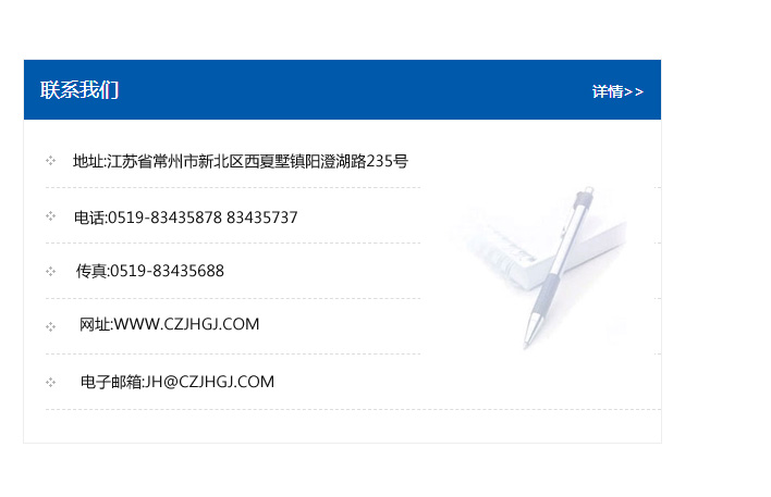 地址:常州市新北區友邦商務大廈1幢16、17層  電話:0519-85101652  傳真:0519-85112595  郵編:213022  網址:www.cz-jiayue_cn.eaaeae.com  郵箱:xiajifengaa@163.com